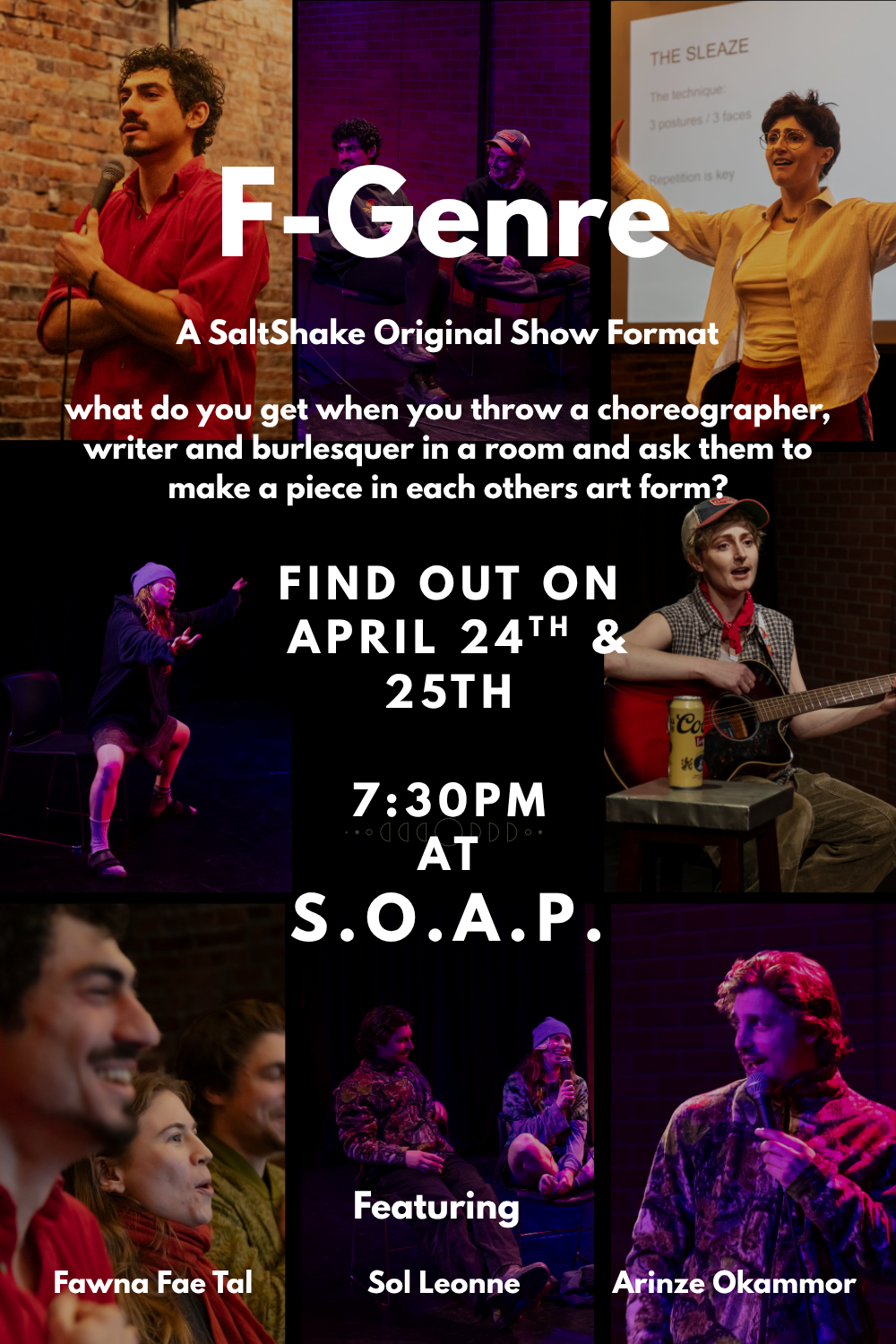 Join SaltShake Productions for 2 nights of genre swapping bafoonery featuring Arinze Okammor, Fawna Fae Tal, and Sol Leone.